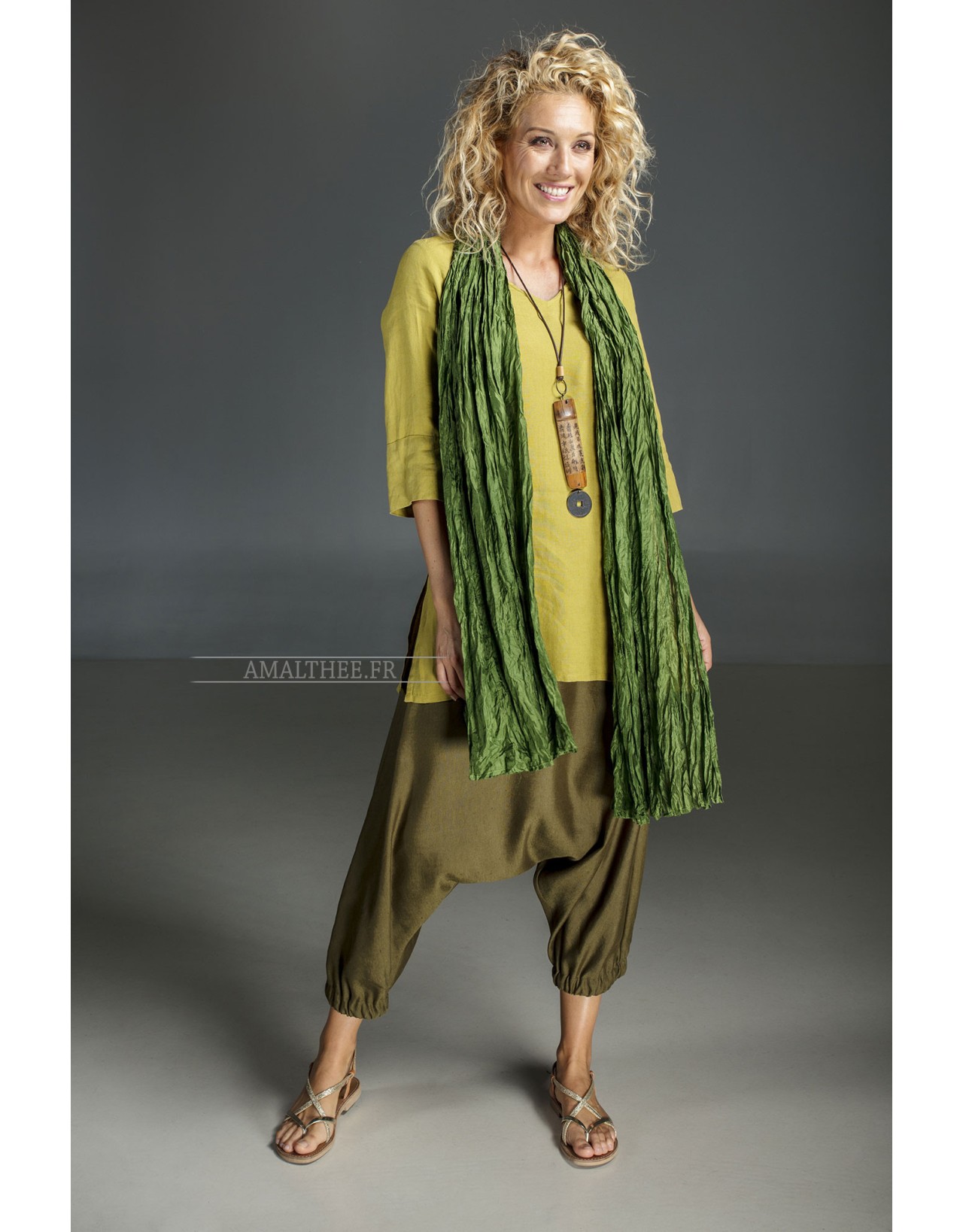 Large crumpled silk scarf in bottle green color, with a soft and supple texture. It can be elegantly worn on all your casual outfits, both in summer and winter. Amalthee creation and French manufacturing.