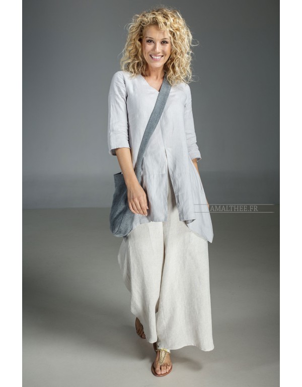 Porté ici avec un pantalon baba en lin naturel et un sac en lin épais