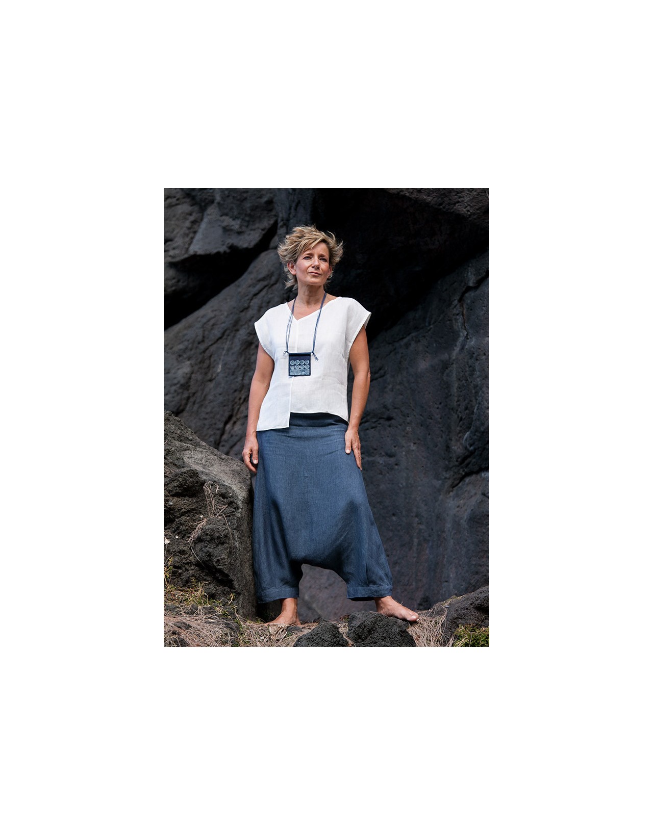 Top in fine white linen that gives a holiday air, goes wonderfully well with an Adrien harem pants. Amalthee creation and French manufacturing.